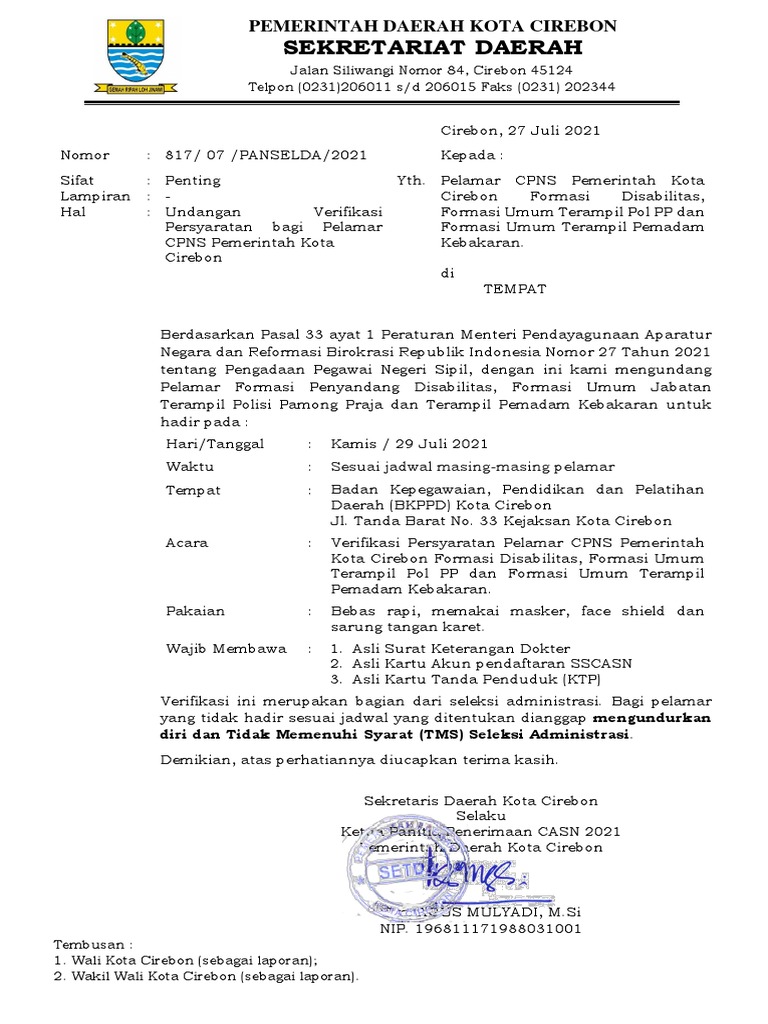 . CPNS 2021 Pemkot Tarakan Buka 47 Formasi Jalur Disabilitas Masih Kosong Berikut Jadwal Pengumuman Hasil SKD dan SKB CPNS Tarakan 2021 Jangan sampai Lalai Berikut Ini Penyebab Peserta SKB Gagal Lolos CPNS 2021. Dibentuk Berdasarkan Peraturan Daerah Kota Cirebon Nomor 7 Tahun 2016 tentang Pembentukan dan Susunan Perangkat Daerah Kota Cirebon.