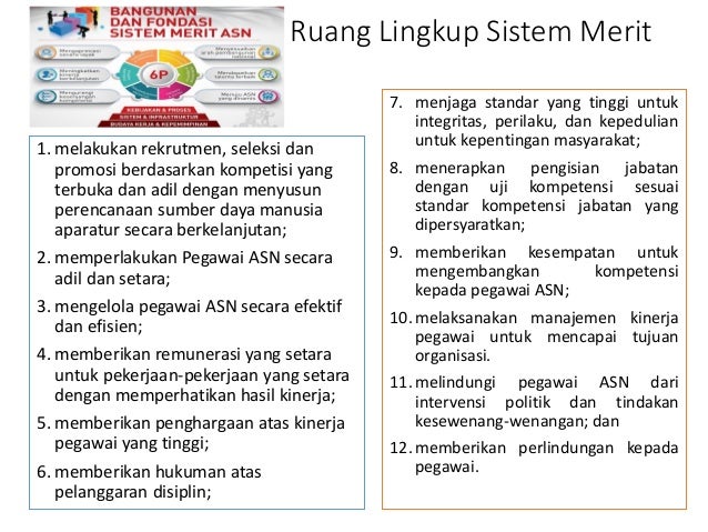 Sekjen DPR terima penghargaan penerapan sistem merit manajemen ASN Sementara itu Tim Rumah Perubahan mendukung keinginan BPSDM Jatim dan berharap manfaat dari kerja sama ini akan ada banyak hal yang bisa dikembangkan bersama. . 1 rekruitmen pengembangan 2 pegawai 3 promosi 4 kesejahteraan manajemen 5 kinerja 6 disiplin etika 7 pensiun.