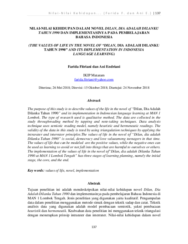 Doc Nilai Nilai Kehidupan Dalam Novel Dilan Dia Adalah Dilanku Tahun 1990 Dan Implementasinya Pada Pembelajaran Bahasa Indonesia The Values Of Life In The Novel Of Dilan Dia Adalah Dilanku Tahun 1990 And