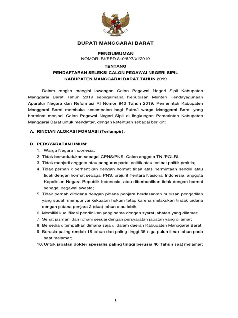 Pengumuman Formasi Cpns Manggarai Barat Tahun 2019 Pdf